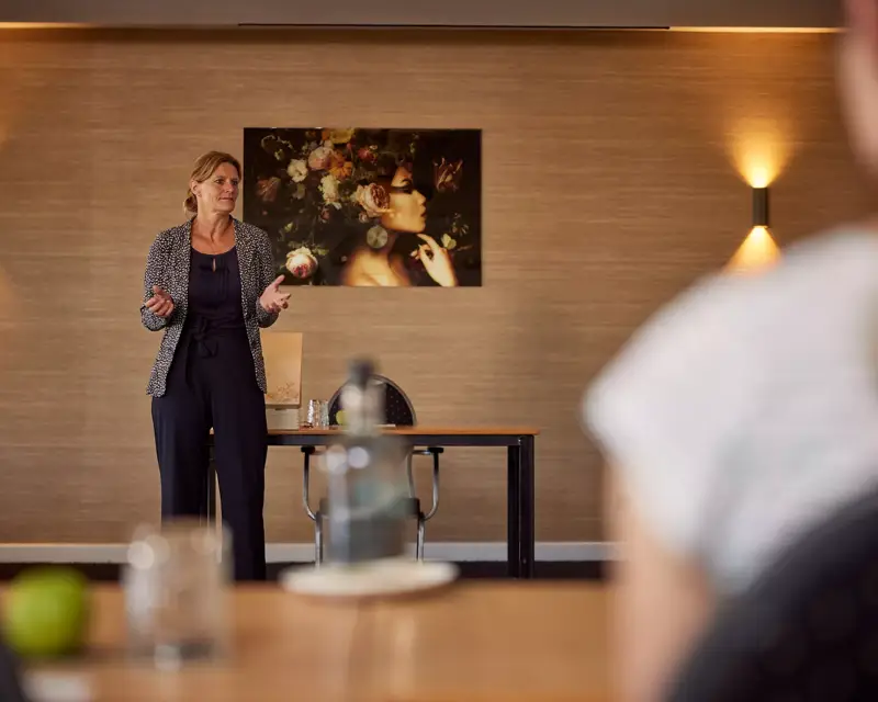Unser Verbindungsgang führt zum Boomvalk-Raum. Er hat eine Fläche von 45 m² und eignet sich ideal für kleinere Besprechungen. Der Raum verfügt über kostenloses WLAN, Tageslicht und einen LED-Fernseher.