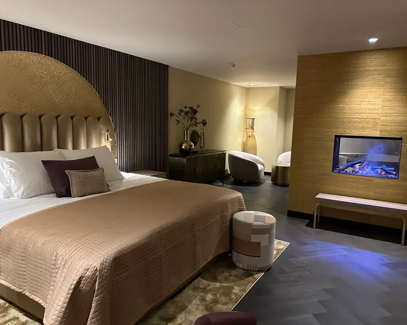 Sinds kort kunt u genieten van onze luxe Royal Suite Gold! Boek en kom tot rust in deze luxueuze suite. De ruime suite van 58m2 is gelegen op de begane grond en is volledig afgewerkt met goud tinten. U kunt genieten van een riante kamer met open badkamer inclusief een XL bubbelbad en aparte inloopdouche beschikkend over een tweepersoons stortdouche, een apart toilet en de suite is uitgerust met een sfeervolle openhaard. Daarnaast heeft u de mogelijkheid om buiten te ontspannen op het aangelegen terras. De Royal Suite Gold biedt u een uitermate luxe beleving, gecombineerd met warme tinten die u thuis laten voelen. De juist combinatie om optimaal te ontspannen.