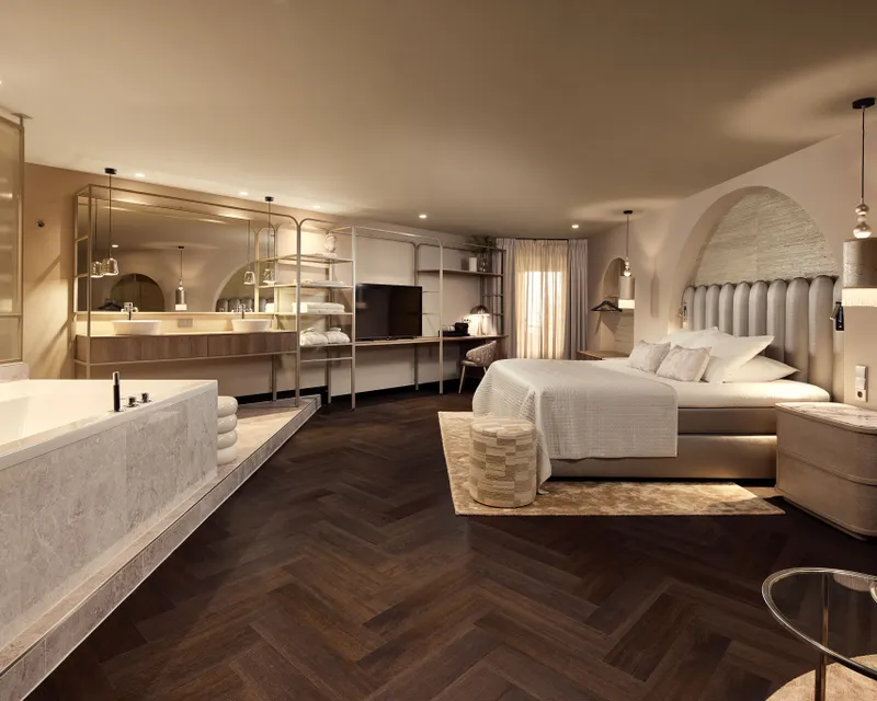 Sinds kort mogen we u verwelkomen in onze Royal Suite Silver! Boek en kom tot rust in deze elegante suite. De ruime suite van 48 m2 is gelegen op de 1e verdieping en is volledig afgewerkt met zilver tinten. U kunt genieten van een riante kamer met een kingsize bed, open badkamer inclusief een XL bubbelbad en aparte inloop douche beschikkend over een tweepersoons stortdouche en een apart toilet. Daarnaast kunt u profiteren van een fijn balkon. De Royal Suite Silver biedt u een chique beleving, gecombineerd met heldere tinten waardoor u een fris en luxe verblijf tegemoet gaat.